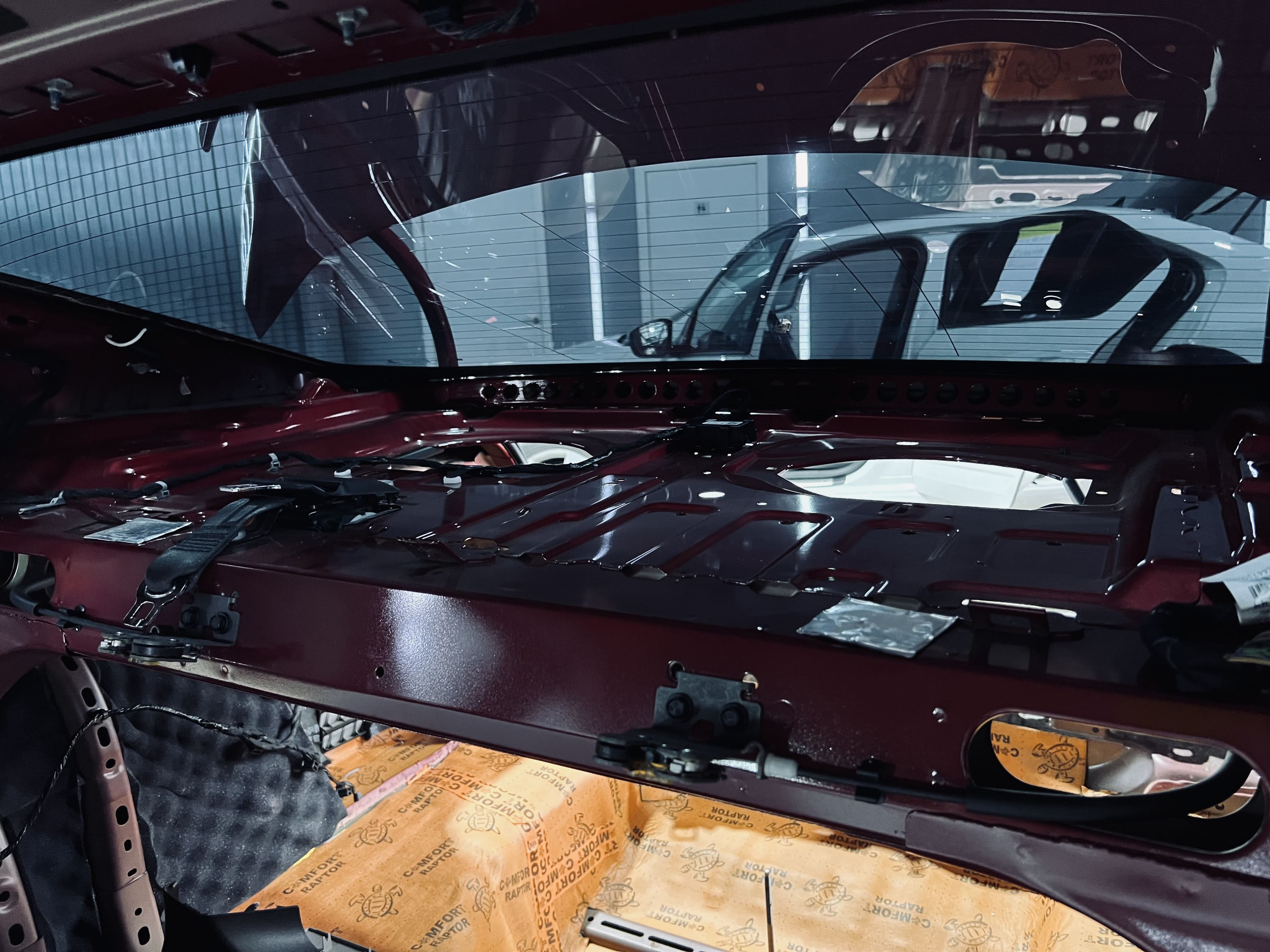 Зона над багажным отсеком также была обработана для дополнительного снижения шума. Мы применили комбинацию вибро- и шумоизоляционных материалов.