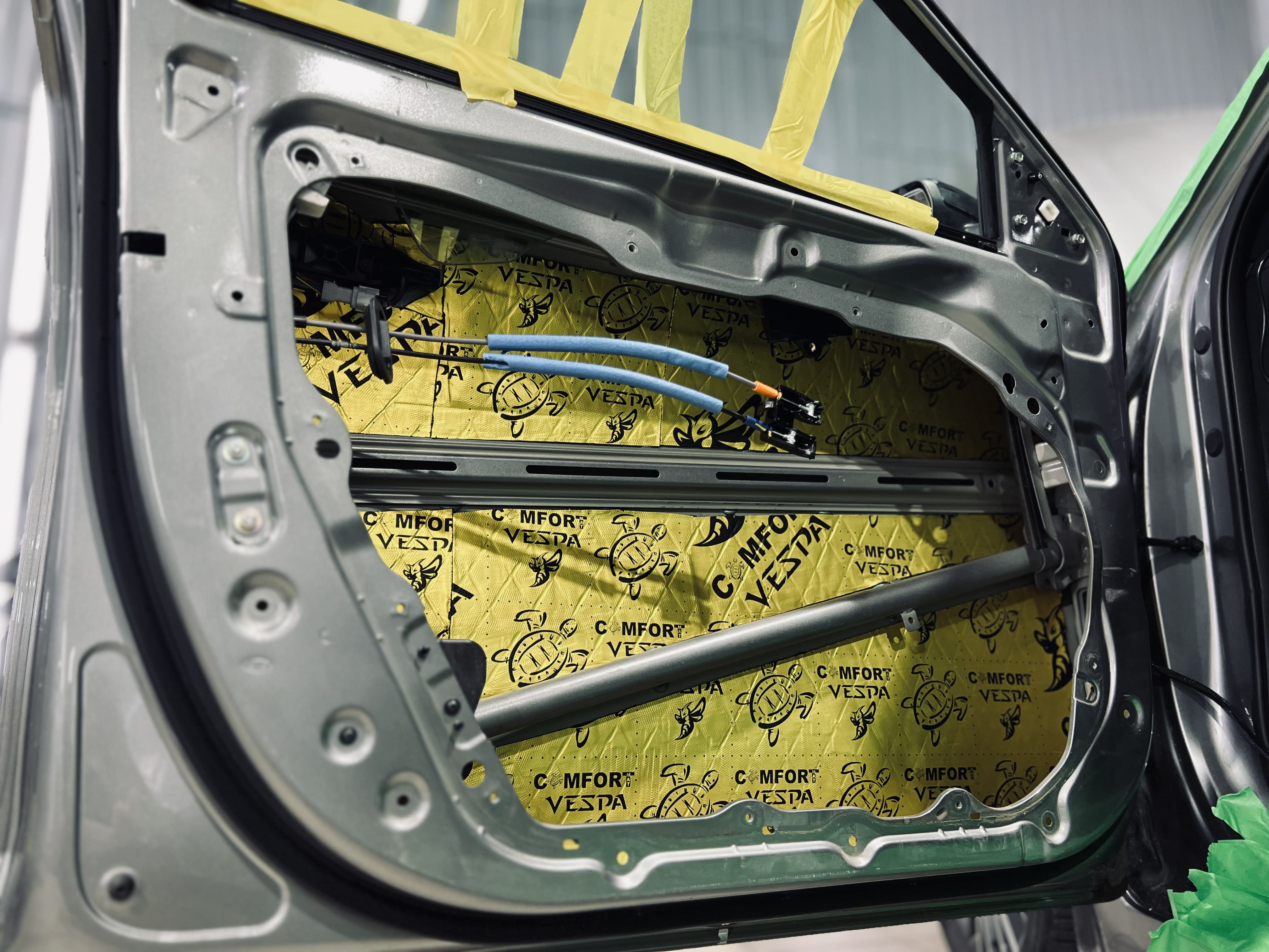 Первым слоем на двери и дверь багажника нанесли виброизоляцию Comfort Mat Vespa.